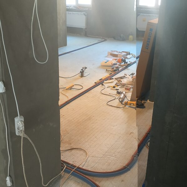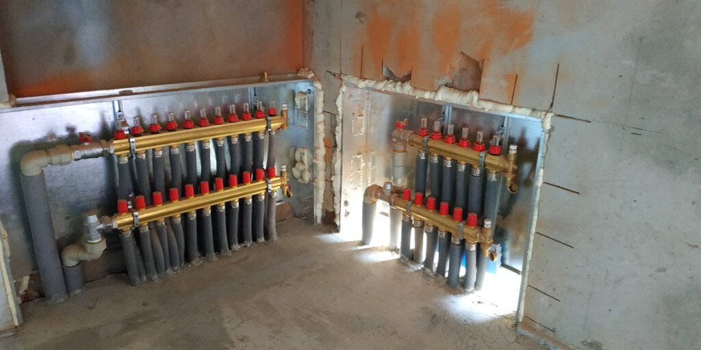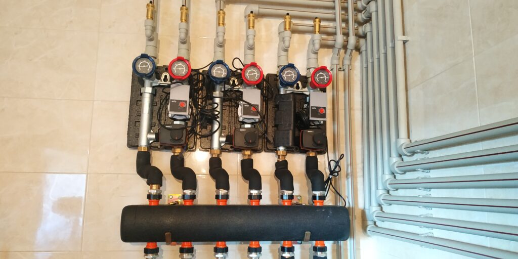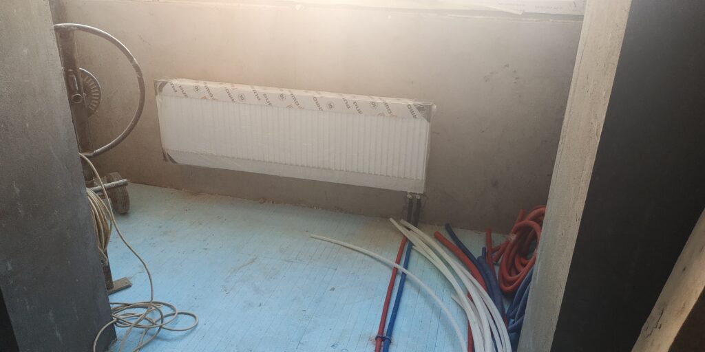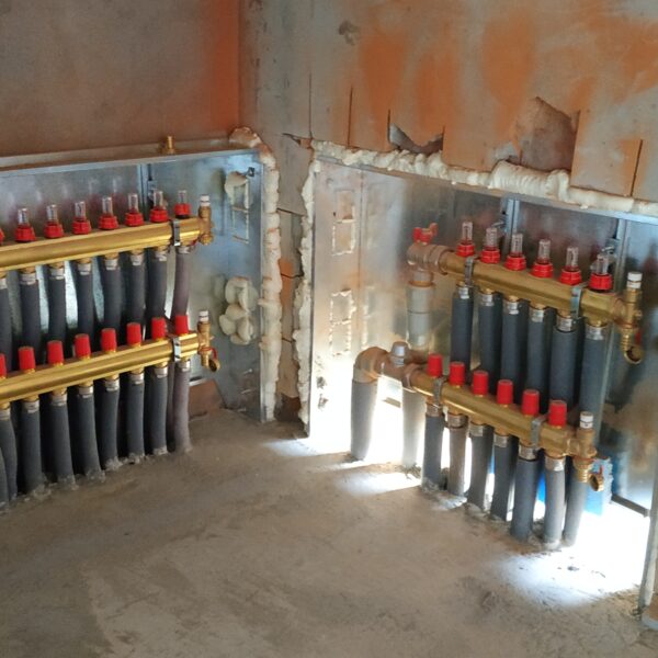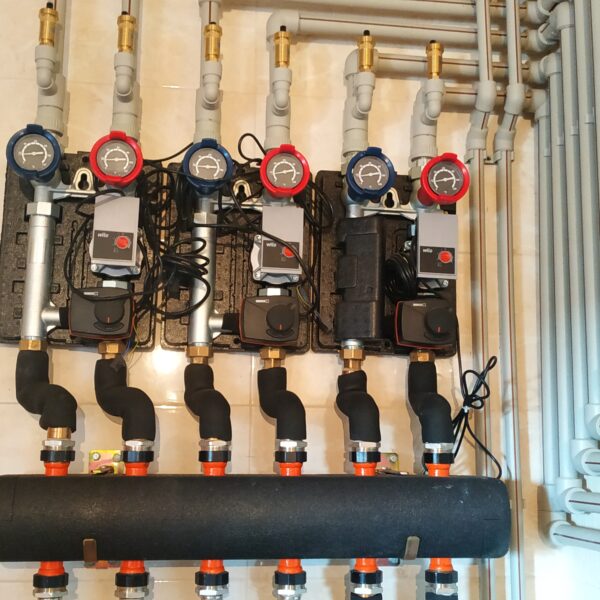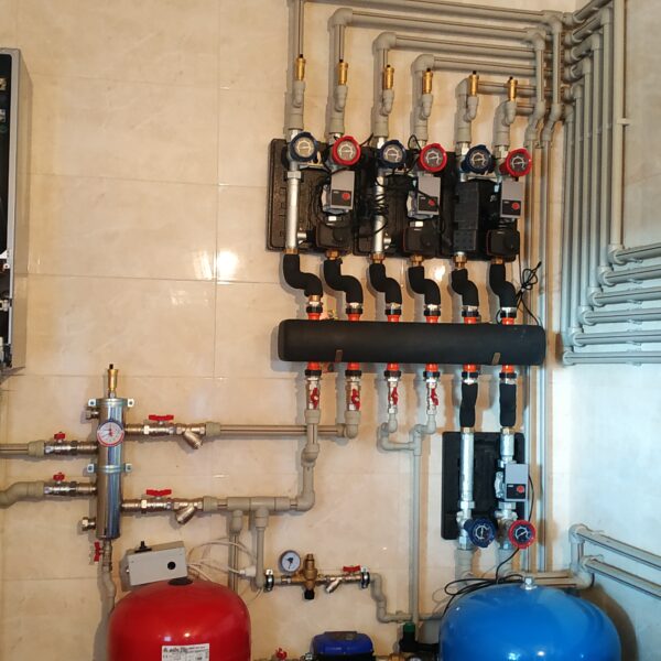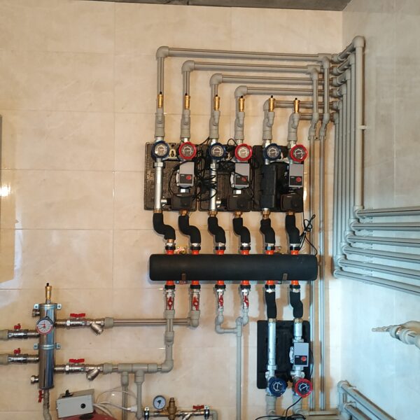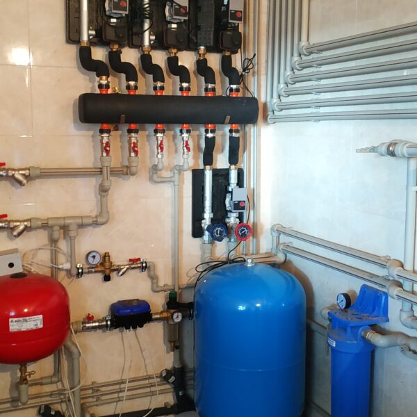 Топкова в будинку побудована на базі газового конденсаційного котла Buderus. Опалення в будинку комбіноване – гідравлічний тепла підлога на базі системи TM HeatPex і радіатори TM Purmo. Така система була спроектована через підвищених тепло втрат будинку. Управління температурою в приміщеннях здійснюється за допомогою кімнатних термостатів ТМ Danfoss.